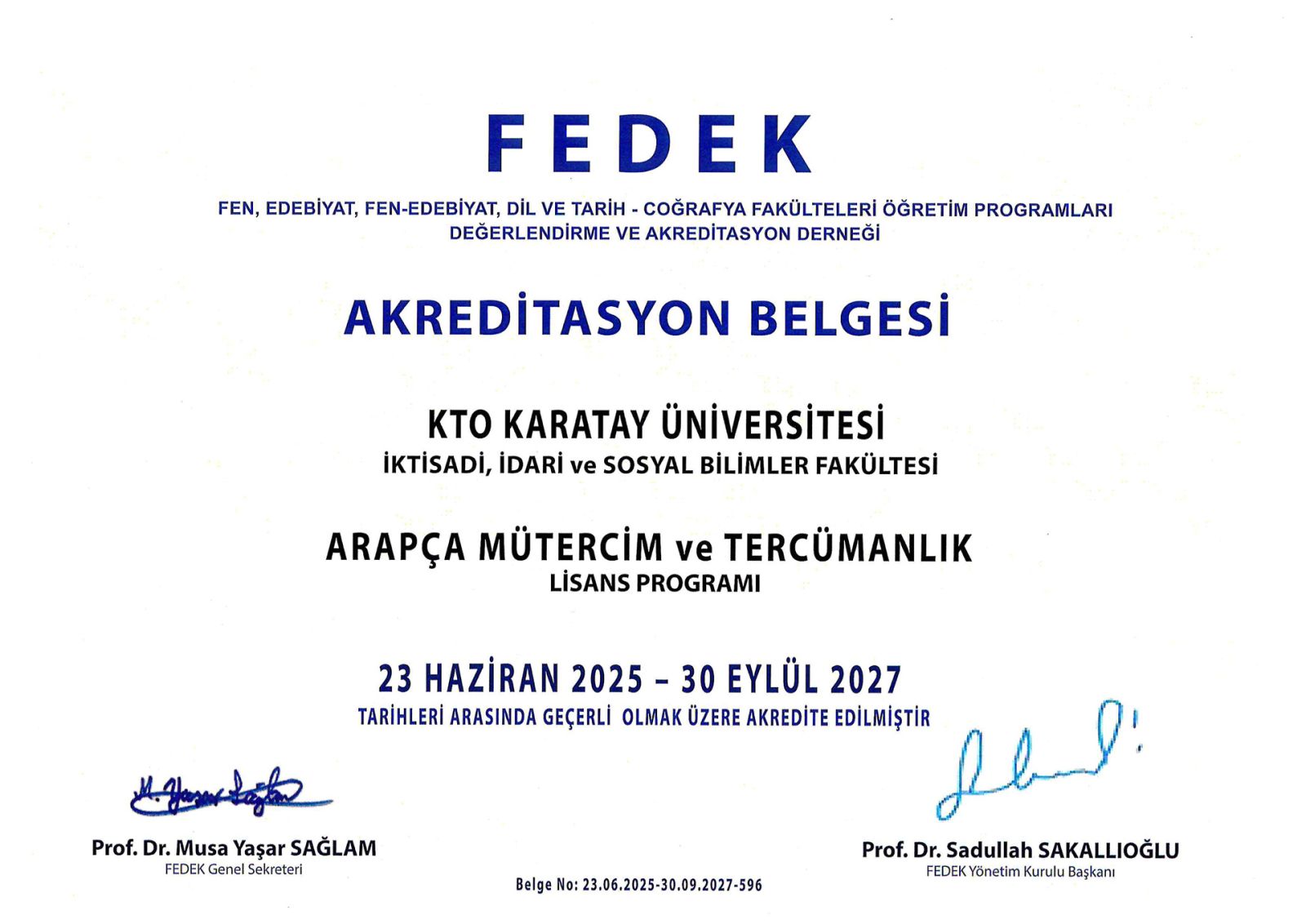 Arapça Mütercim ve Tercümanlık Bölümü Akreditasyon Belgesi