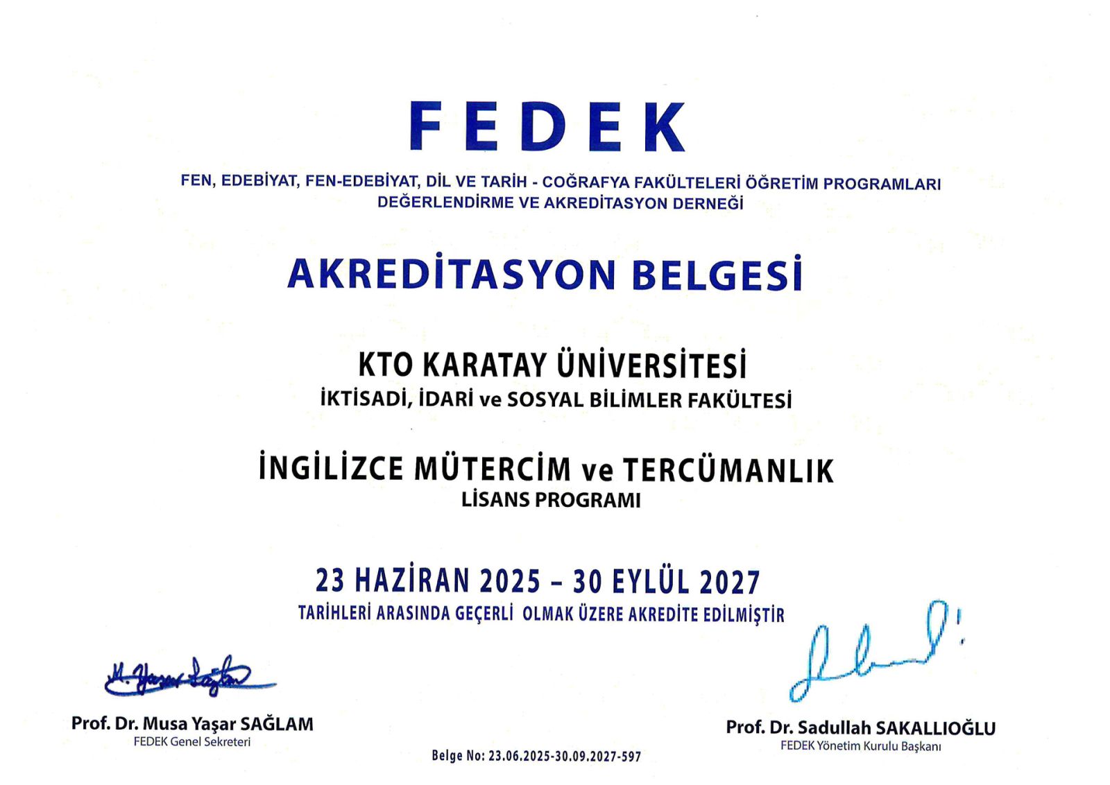 İngilizce Mütercim ve Tercümanlık Bölümü Akreditasyon Belgesi