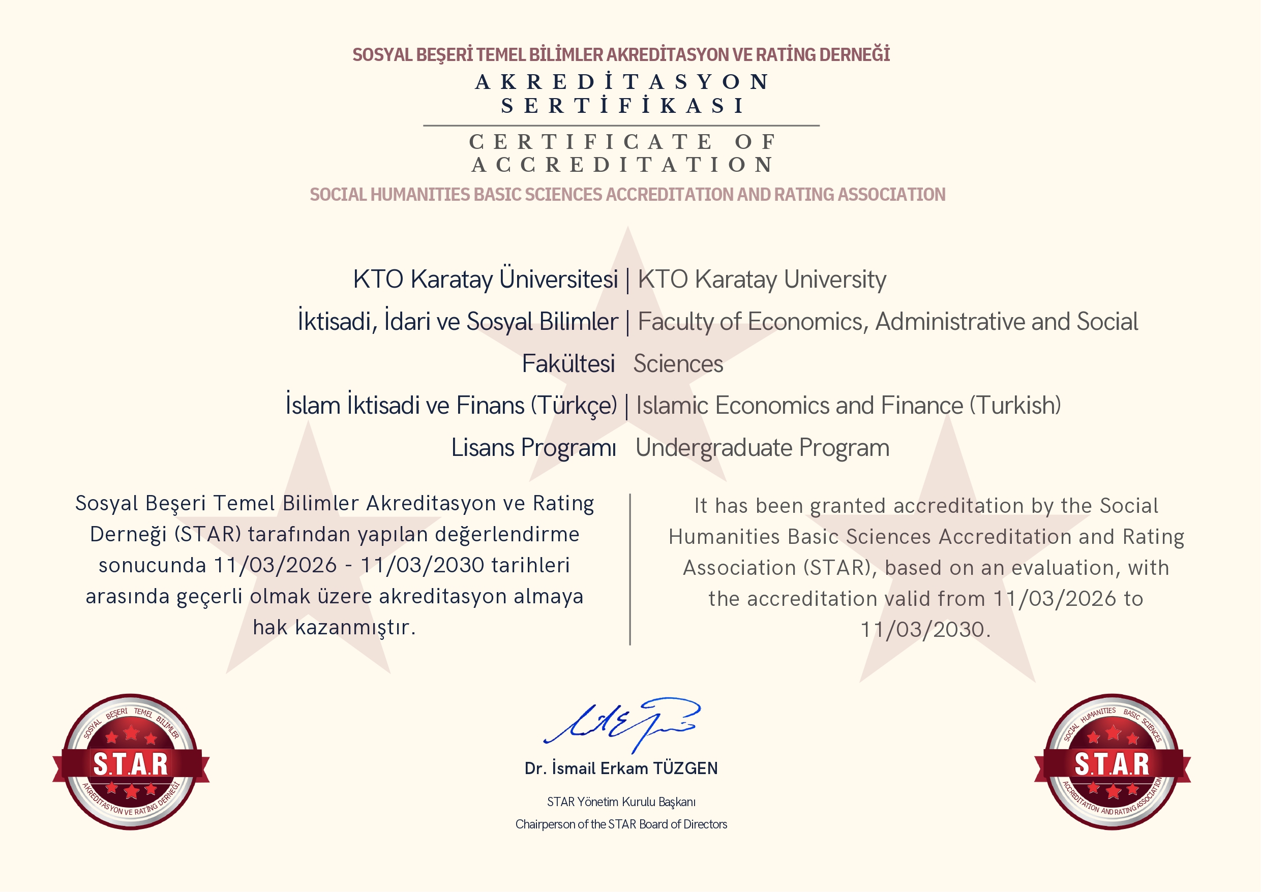 İslam İktisadı ve Finans Programı Akreditasyon Belgesi